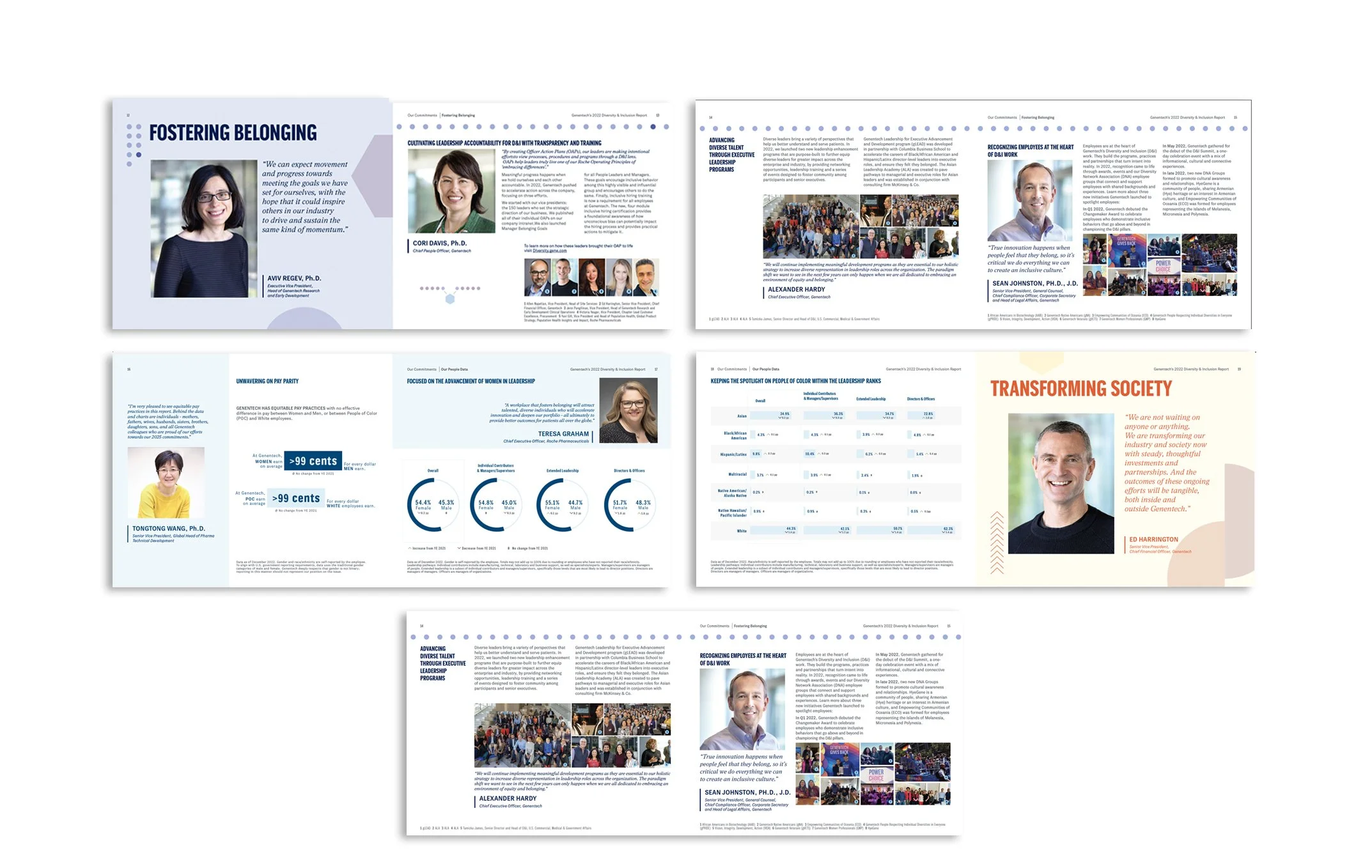 Pages from Genentech’s Annual D&I Report about their commitment to diversity and inclusion